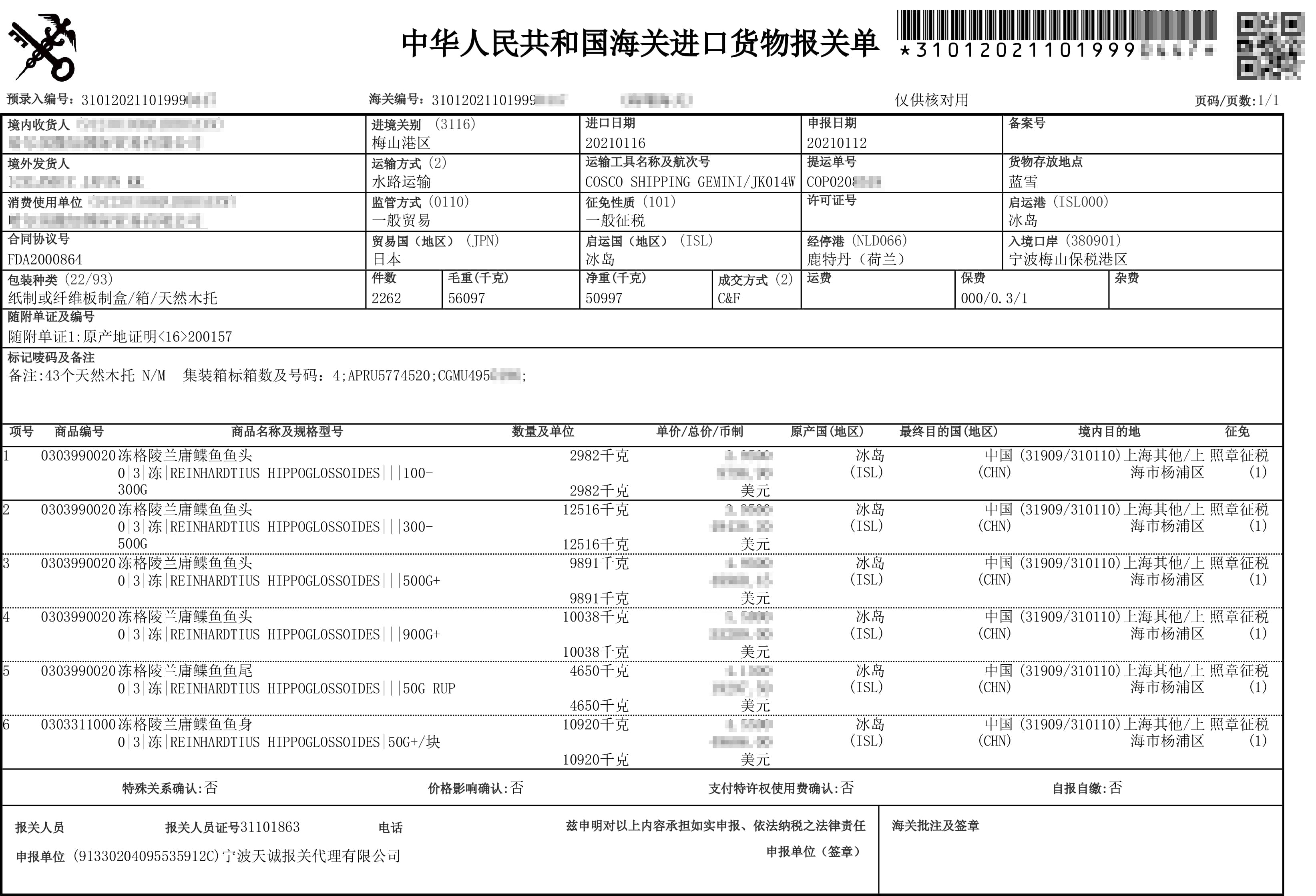 【案例】 冰岛进口冻鱼头至宁波港口...